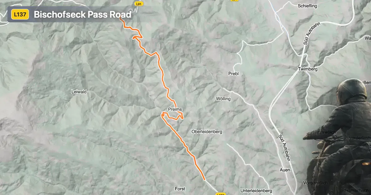 The Bischofseck Pass road connects the towns of Bad Sankt Leonhard im Lavanttal and Wolfsberg in the Austrian state of Carinthia. The route runs through the Saualpe and Lavanttaler Alpen, forming part of the broader Alps mountain system. The road's alignment takes riders from the spa town of Bad Sankt Leonhard im Lavanttal to the district capital Wolfsberg, passing through the settlement of Weißenbachstraße. This corridor is known for its alpine scenery and the technical challenge posed by the Bischofseck Pass, which reaches an elevation of 1,357 m (4,452 ft). An interactive map showing the road's route can be found at the end of the article.