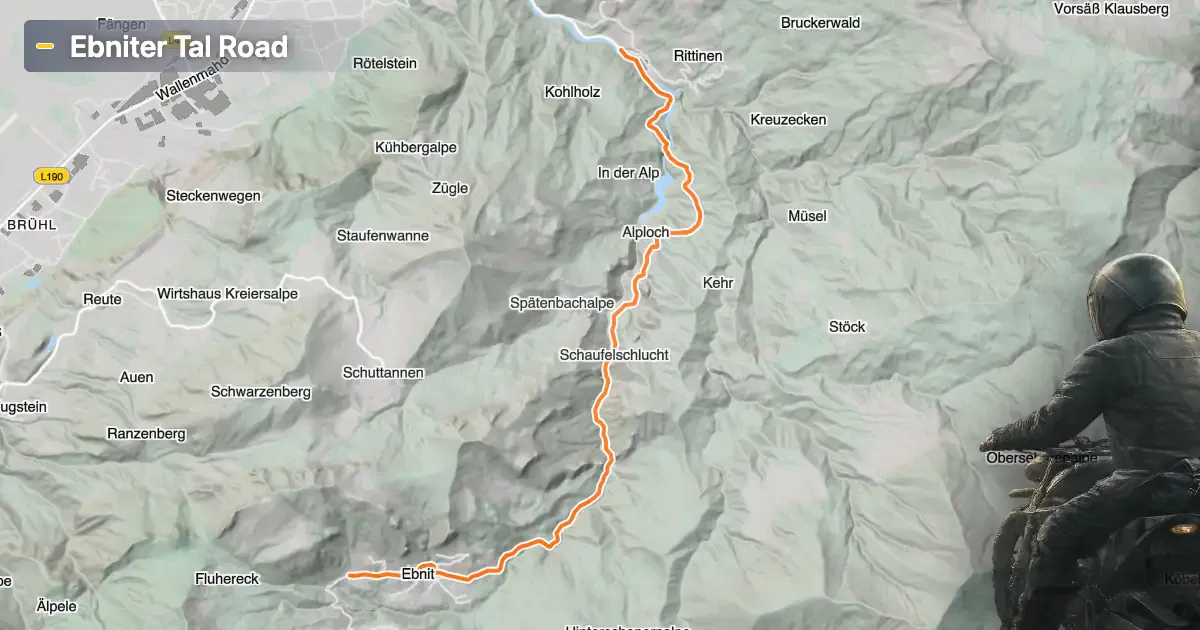 One of the defining features of the Ebniter Tal Road is its close proximity to the Dornbirner Ache, a river that accompanies the road for much of its length before flowing into Lake Constance and the Rhine. The route also traverses the Ebniter Valley, a lesser-known but picturesque alpine valley. Riders will encounter several viewpoints along the way, offering opportunities to pause and appreciate the surrounding mountain scenery. The road's passage through the Bregenz Forest Mountains provides access to hiking trails and natural observation points, making it a suitable choice for those interested in combining motorcycling with outdoor activities. The nearby town of Dornbirn is known for attractions such as the Rappenloch Gorge, a notable geological site, while Hohenems offers cultural sites including the Palace Hohenems.