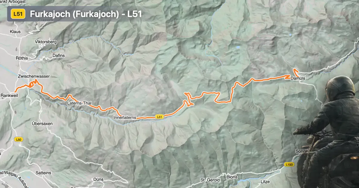 The L51 extends for approximately 28.95 km (18 miles), offering a mix of gently curved and moderately twisty sections. The road surface is asphalt and is generally rated as very good, providing reliable grip and comfort for motorcyclists. The majority of the route is wide (about 85%), with some middle-width segments (12%) and a minimal proportion of narrow stretches (1%). Lane configuration varies, with just over half of the road being single-lane (about 51%) and a smaller portion featuring two lanes (about 18%). The elevation ranges from 475 m (1,558 ft) at its lowest point to 1,750 m (5,741 ft) at its highest, with the Furkajoch pass itself reaching 1,759 m (5,771 ft). The road passes through inhabited areas for just over half its length, providing a blend of rural and alpine environments. Speed limits along the L51 fluctuate between 40 km/h (25 mph) and 80 km/h (50 mph), depending on the section and proximity to settlements.