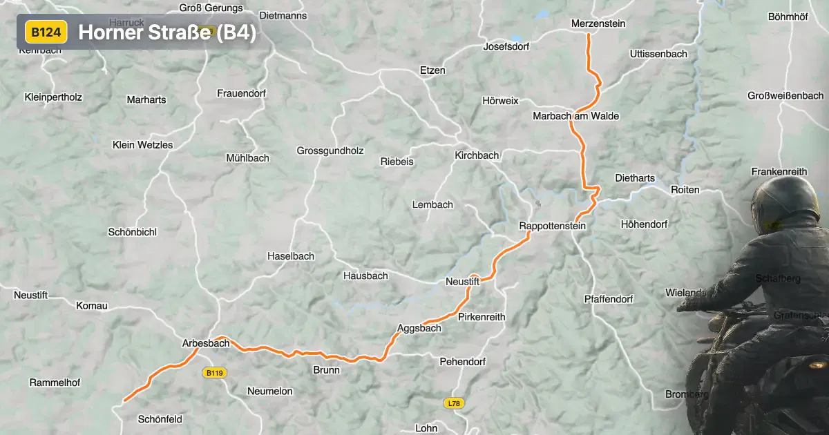 One of the notable features of the B4 is its proximity to several viewpoints, providing opportunities for riders to pause and appreciate the surrounding landscapes. The region is characterized by rolling hills, forests, and agricultural land, typical of Lower Austria. Zwettl, near the starting point, is home to the Zwettl Abbey, a Cistercian monastery with a rich history dating back to the 12th century. The area also offers access to local hiking trails and rural attractions, making it a suitable base for further exploration. While the B4 itself is not renowned for dramatic mountain scenery, its viewpoints and rural charm contribute to a pleasant touring experience.