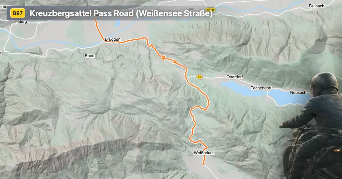 The Weißensee Straße is situated in the Austrian state of Carinthia, connecting the vicinity of Greifenburg with the region surrounding Lake Weißensee. The road crosses the Kreuzbergsattel, a mountain pass at an elevation of 1,074 m (3,524 ft), and passes through the Naturpark Weißensee. The route skirts the Kreuzeckgruppe and Gailtaler Alpen mountain ranges, offering access to the valleys of Oberes Drautal, Gitschtal, and Gnoppnitztal. The proximity to Greifenburg, a small town located less than 10 km (6.2 miles) from both ends of the road, makes it a convenient starting or ending point for riders. An interactive map showing the road can be found at the end of the article.