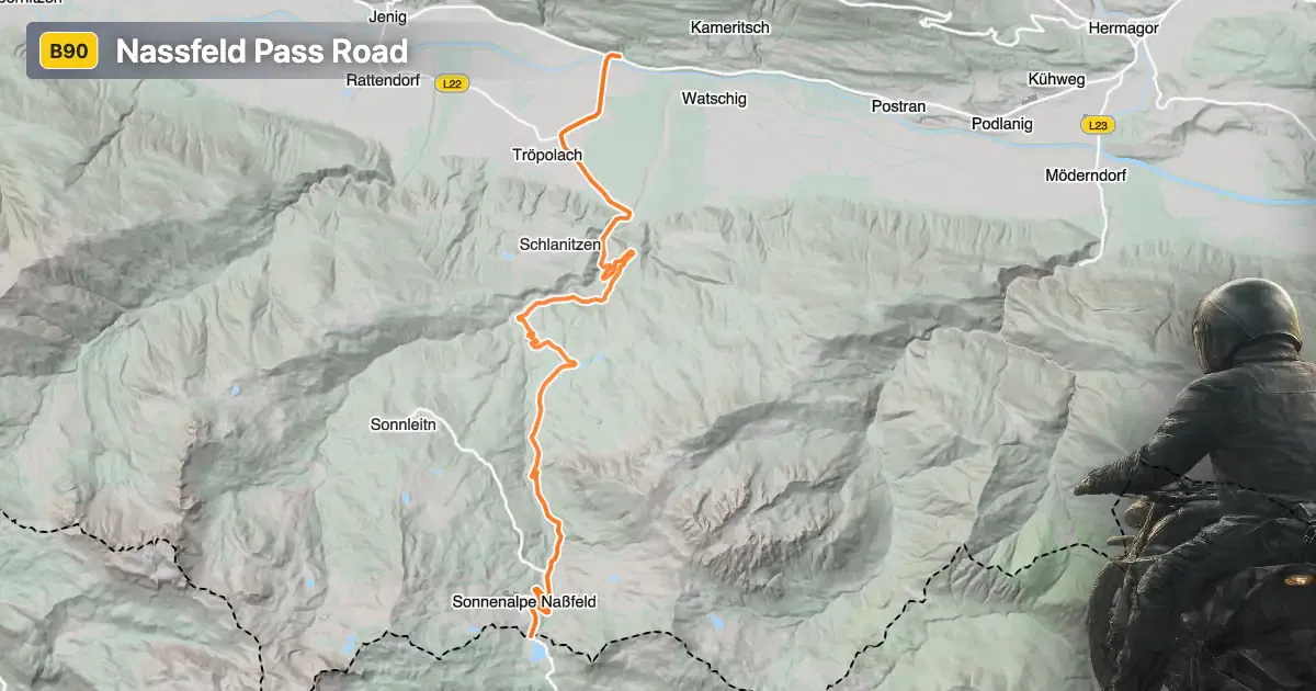 The Nassfeld Pass Road is subject to seasonal closures due to snow and adverse weather conditions, typically during the winter months. The exact closure period can vary depending on snowfall and maintenance schedules, so riders are advised to check current conditions before planning a trip. There are no permanent restrictions for motorcycles, but temporary closures may occur due to roadworks or events. For up-to-date information on road status, consult the ASFINAG Traffic Information service. The road is generally open to all vehicles during the riding season, but caution is advised in wet or icy conditions, especially on the higher, twistier sections.