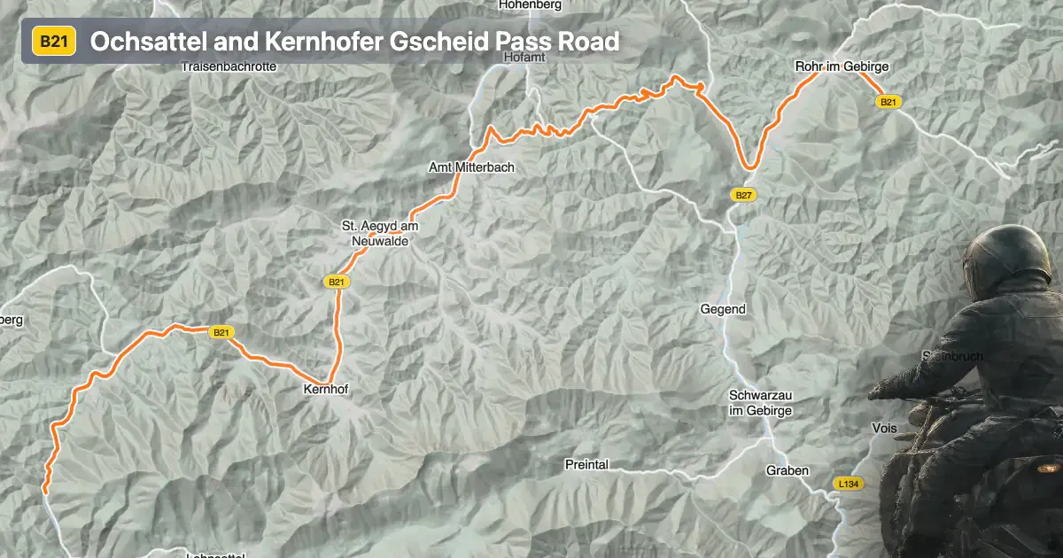 The route’s defining features are the Ochsattel Pass (820 m / 2,690 ft) and the Kernhofer Gscheid Pass (970 m / 3,182 ft), both of which are well-known among local motorcyclists and touring enthusiasts. The Ochsattel Pass is detailed on Wikipedia, while the Kernhofer Gscheid Pass is also documented on Wikipedia. The road’s alignment through the Mürzsteger Alpen, Gutensteiner Alpen, and Türnitzer Alpen provides riders with continuous mountain vistas and access to several viewpoints along the way. The proximity to the Salza River and the valleys it traverses adds to the route’s appeal for those interested in natural landscapes. The town of Mariazell, located nearby, is a notable attraction, renowned for its basilica and as a center of pilgrimage in Austria.