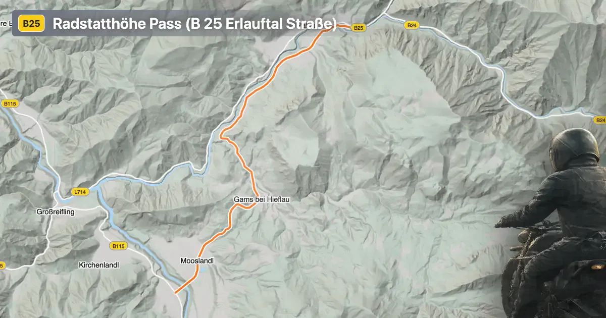The B 25 Erlauftal Straße extends for approximately 11.1 km (6.9 miles), with elevations ranging from 468 m (1,535 ft) to 643 m (2,110 ft) at its highest point on the Radstatthöhe pass. The road surface is asphalt, with a generally good quality rating, though some sections may show moderate wear. The route is moderately curvy, offering a mix of gently curved and straight segments, making it suitable for riders seeking a balanced experience rather than extreme twistiness. Road width varies, with the majority (about 70%) being wide enough for comfortable two-way traffic, while narrower sections are less common. Two-lane stretches dominate (about 66%), with some single-lane portions, especially near the pass. The road passes through both inhabited and remote areas, with roughly half its length adjacent to settlements. The proximity to the Salza river (about 43% of the route) adds to the riding atmosphere, as does the brief passage through the Steirisches Ennstal valley. The maximum speed limits are 100 km/h (62 mph), 70 km/h (43 mph), and 50 km/h (31 mph), depending on the section.