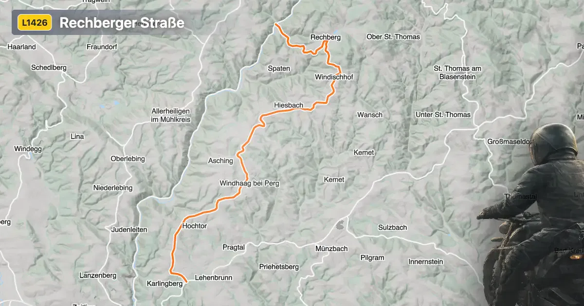 Rechberger Straße is a public road and is generally open to motorcycles throughout the year. There are no known seasonal closures specific to this route, and it remains accessible during winter months, although riders should exercise caution in adverse weather conditions, as snow and ice can affect road safety. There are no event-related closures reported for this road. As always, it is advisable to check local traffic updates before setting out, especially during periods of road maintenance or inclement weather.