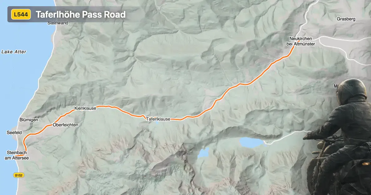 The Taferlhöhe Pass Road covers a distance of approximately 15.7 km (9.8 miles), with elevations ranging from 470 m (1,542 ft) to 845 m (2,772 ft) above sea level. The road is predominantly wide (about 97%), with two lanes for most of its length, providing ample space for overtaking and maneuvering. The surface is asphalt and generally rated as very good, offering reliable grip and comfort for motorcyclists. The route is moderately curvy, with a mix of gently curved and more technical sections, particularly as it ascends and descends the Taferlhöhe Pass at 829 m (2,720 ft). Speed limits vary along the route, typically ranging from 50 km/h (31 mph) to 100 km/h (62 mph), with some sections limited to 60 km/h (37 mph), 70 km/h (43 mph), or 80 km/h (50 mph) depending on local conditions. The road passes through several settlements, including Winkl, Neukirchen, Steinbach, and Großalm, with about 44.6% of the route traversing inhabited areas.