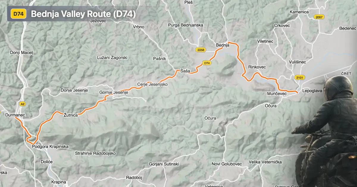 The D74 is situated in the northern part of Croatia, within the region known as Hrvatsko Zagorje. The road runs between the towns of Krapina and Lepoglava, passing through several settlements including Trakošćanska ulica, Ulica Grofova Drašković, Đurmanec, Trg Svete Marije, and Trakošćanska. The route closely follows the Bednja River for a portion of its length, offering riders a glimpse of the valley’s natural landscape. An interactive map showing the precise route of the D74 can be found at the end of this article.