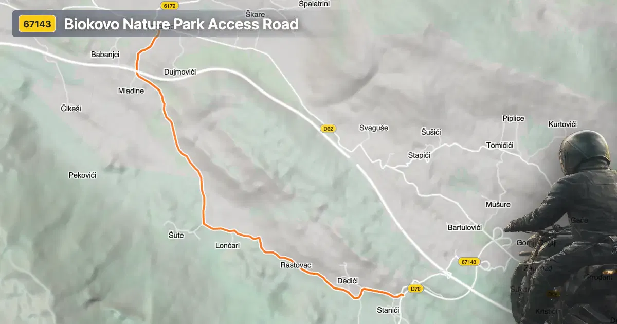 Lokalna cesta 67143 is situated in southern Croatia, providing access to the renowned Biokovo Nature Park. The road begins near the village of Grabovac and skirts the park’s boundaries, offering riders a gateway to the rugged slopes and panoramic vistas of the Biokovo mountain range. The region is characterized by its Mediterranean climate and proximity to the Adriatic coast, making it a popular destination for both nature enthusiasts and motorcyclists. An interactive map showing the route can be found at the end of this article.