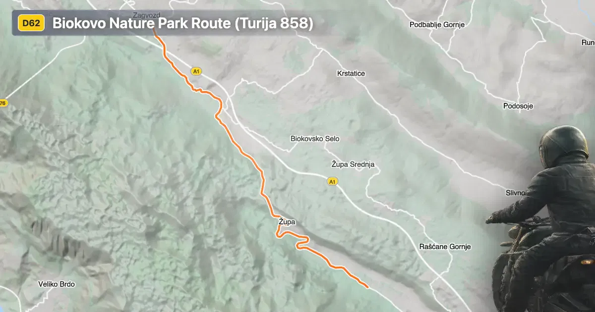 Biokovo Nature Park is the primary attraction along Turija 858. The park is renowned for its diverse flora and fauna, as well as its dramatic karst landscapes. Riders may wish to explore the park’s hiking trails or visit the Biokovo Mountain area, which offers panoramic views of the Adriatic coast. The nearby village of Zagvozd serves as a convenient starting point, providing basic amenities and access to the broader Dalmatian hinterland. The settlement of Turija, while small, marks a key waypoint along the route and offers a glimpse into rural Croatian life within the park’s boundaries.