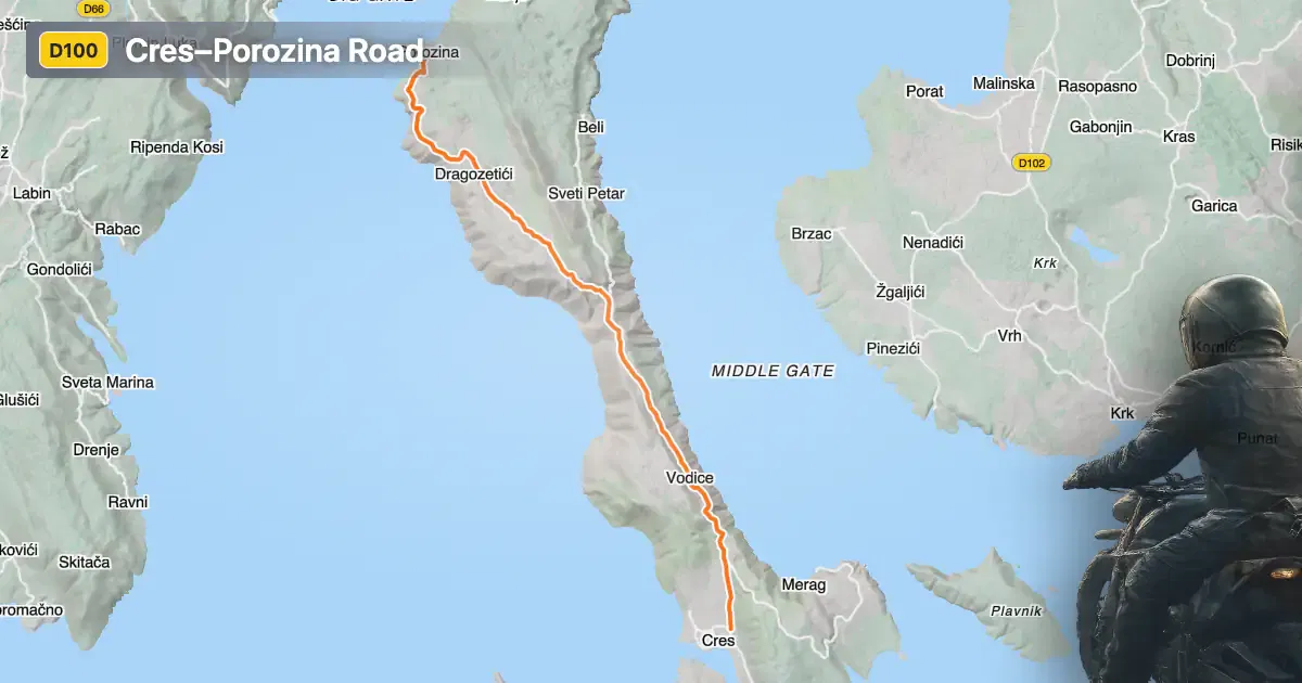 The Cres–Porozina road runs entirely on the island of Cres, located in the northern Adriatic Sea, Croatia. The route connects the town of Cres in the south with the village of Porozina in the north, serving as the main thoroughfare for both local traffic and visitors arriving via the ferry from the mainland. The road’s position makes it a vital link for exploring the island’s interior and accessing its coastal viewpoints. An interactive map showing the full extent of the Cres–Porozina road can be found at the end of this article.