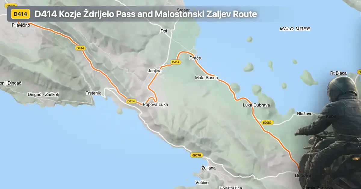 A defining feature of the D414 is its crossing of the Kozje Ždrijelo mountain pass, which provides expansive views of the surrounding landscape. The road also passes through the Malostonski zaljev i Malo more nature reserve, an area recognized for its ecological significance and traditional oyster farming. Along the route, riders will encounter several viewpoints offering vistas of the bay and the Adriatic Sea. The proximity to these natural attractions makes the D414 a popular choice for those interested in combining motorcycling with opportunities for sightseeing and nature observation.