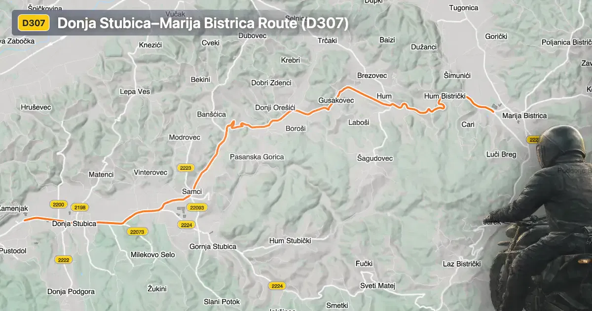 The D307 is notable for its proximity to Marija Bistrica, a prominent pilgrimage destination in Croatia. The Marija Bistrica Sanctuary attracts visitors from across the country and beyond, especially during religious festivals. Donja Stubica, at the other end of the route, is known for its historical significance and cultural heritage, including the Donja Stubica town center and nearby castles. The road itself passes through several local streets and squares, offering glimpses of traditional architecture and rural landscapes characteristic of the Hrvatsko Zagorje region. Riders interested in exploring local culture may find opportunities to visit small museums, local eateries, and historical sites along the way.