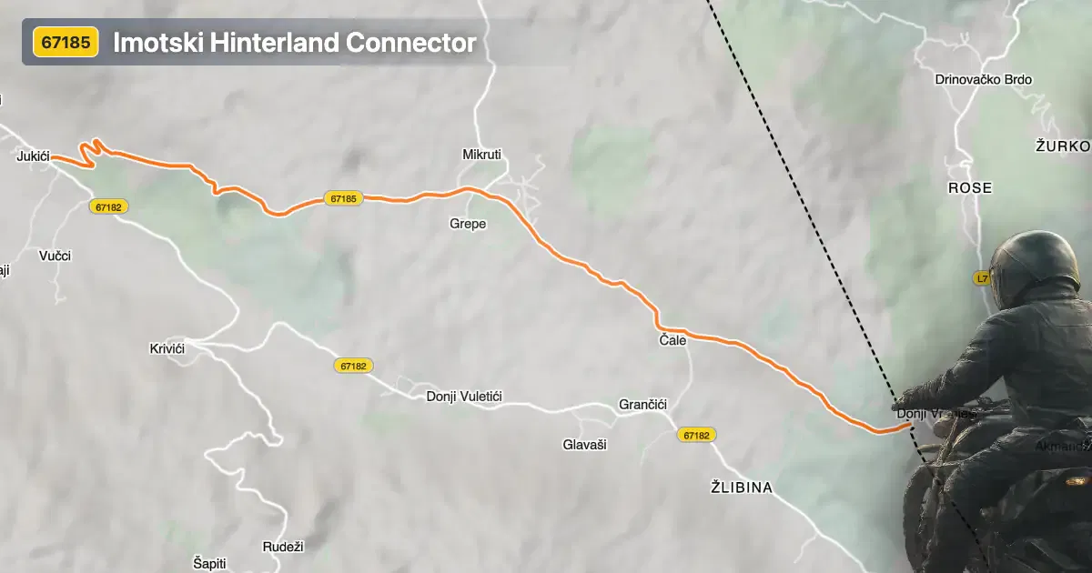 While Lokalna cesta 67185 itself does not directly connect to major tourist attractions, its location in the Dalmatian hinterland places it within reach of several noteworthy sites. The nearby city of Imotski is known for its historic architecture and the famous Blue Lake and Red Lake, both of which are unique karst phenomena. Riders interested in exploring the cultural and natural heritage of the region may consider extending their journey to these destinations. The road also provides access to the broader network of rural routes in Split-Dalmatia County, which are valued for their tranquility and authentic local character.