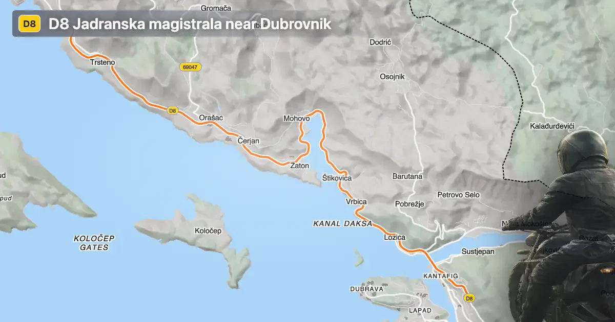 This road begins just outside the city of Dubrovnik, one of Croatia’s most renowned destinations, and extends northwest through several settlements including Lozica, Za Kašćelom, and Pinji, before reaching Na Vodi. The route closely follows the coastline of Zaton bay for a significant portion, providing riders with frequent glimpses of the Adriatic Sea. The road’s proximity to Dubrovnik makes it easily accessible for those staying in or visiting the city. An interactive map showing the route is available at the end of this article.