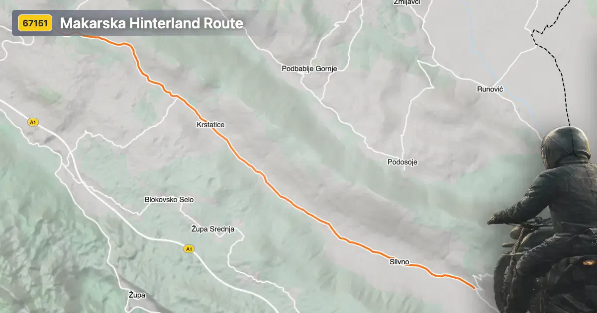 The Makarska Hinterland Route is situated in southern Croatia, running inland from the popular coastal town of Makarska. The road lies within the Split-Dalmatia County, an area known for its rugged karst terrain and proximity to the Biokovo mountain range. The route’s coordinates place it northeast of Makarska, extending through the hinterland between elevations of 344 m (1,129 ft) and 654 m (2,146 ft). This region is characterized by sparse settlements and open landscapes, making it a suitable choice for riders seeking less congested roads. An interactive map showing the route is available at the end of this article.