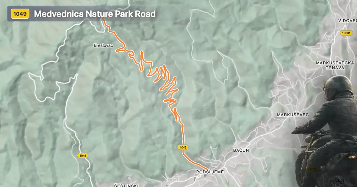 Županijska cesta 1049 is situated in northern Croatia, beginning near the city of Zagreb and extending toward the town of Donja Stubica. The road passes through the settlement of Bliznec and forms a key corridor through Medvednica Nature Park. Its southern access point is easily reached from Zagreb, making it a popular choice for local riders and visitors alike. The route’s northern terminus lies close to Donja Stubica, providing a convenient link between urban and rural environments. An interactive map showing the road’s course can be found at the end of this article.