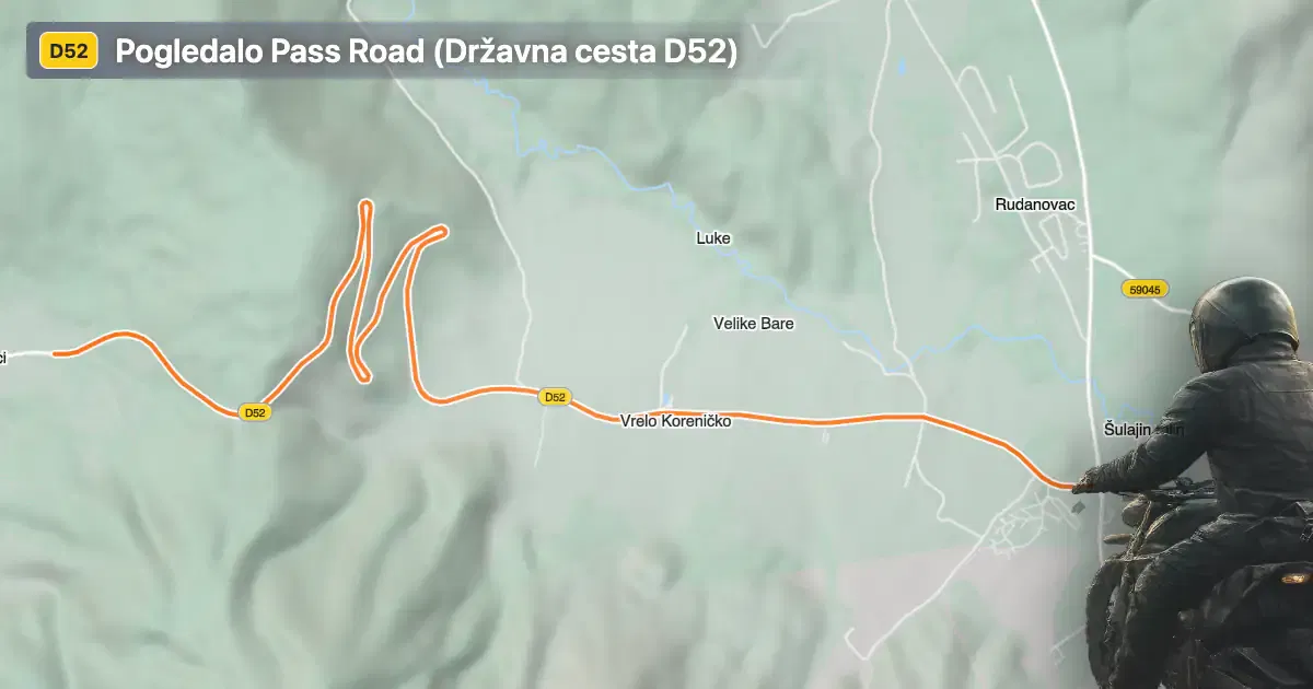 The D52 is an asphalted, two-lane road (about 100%) with a predominantly wide carriageway (about 96%), offering a comfortable riding experience for most motorcycles. The surface quality is generally very good, with only minor imperfections, making it suitable for both touring and sport-oriented bikes. The road is moderately curved, with gentle bends rather than tight switchbacks, allowing for a relaxed pace while still providing some technical interest. Over a length of approximately 6.2 km (3.9 miles), the route ascends from 676 m (2,218 ft) to 885 m (2,904 ft) at its highest point, with the Pogledalo pass marking the summit. Speed limits vary along the route, typically ranging from 90 km/h (56 mph) in open sections to lower limits of 40 km/h (25 mph), 50 km/h (31 mph), and 60 km/h (37 mph) in areas with increased traffic or proximity to settlements. About 35.6% of the road passes through inhabited areas, so riders should remain attentive to local traffic and pedestrians.