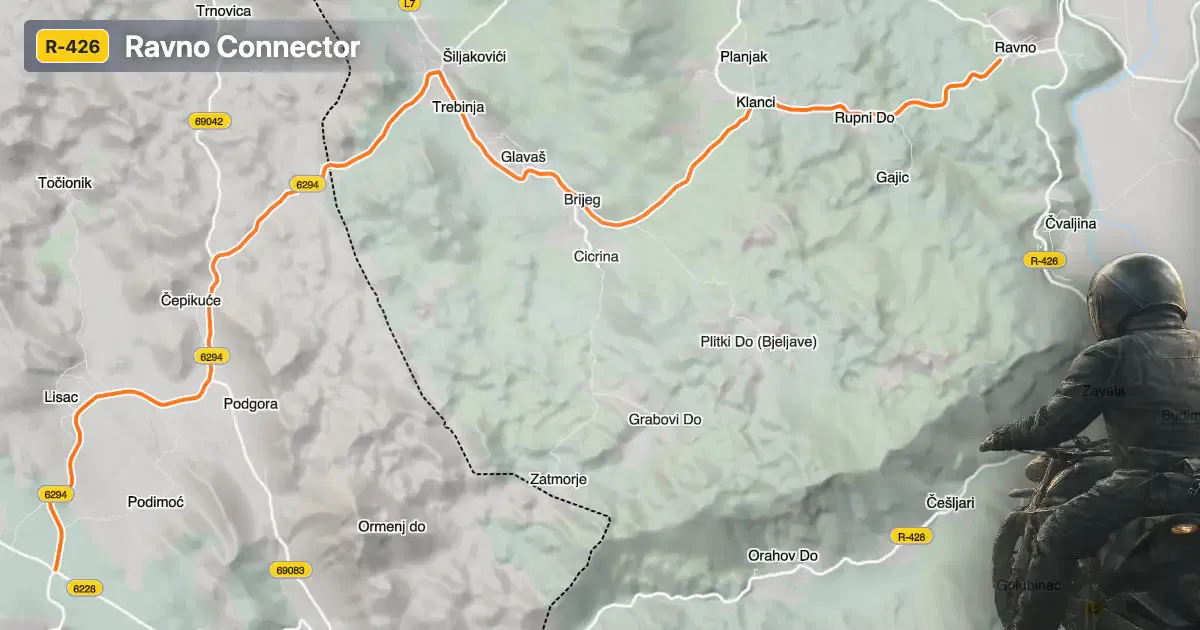 While the official designation is R-6, this road does not have a widely recognized nickname among motorcyclists. Given its location, it is sometimes referred to as the "Ravno Connector" due to its role in linking the village of Ravno with other parts of southern Croatia. The area is notable for its proximity to the Popovo Polje karst field, a unique geological feature that attracts visitors interested in natural landscapes and rural tourism.