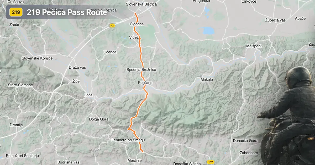 The 219 Pečica Pass Route is situated in eastern Slovenia, beginning near the town of Slovenska Bistrica and extending towards Čatež ob Savi. The road passes through several settlements, including Križni vrh, Spodnja Brežnica, Videž, and Podplat, before reaching its terminus. The route is notable for crossing the Pečica mountain pass at an elevation of 377 m (1,237 ft), providing a connection between the Drava and Sava river basins. The region is characterized by rolling hills and forms part of the broader Alpine landscape, intersecting both the Alps and the Karawanken und Bachergebirge mountain ranges. An interactive map showing the road can be found at the end of the article.