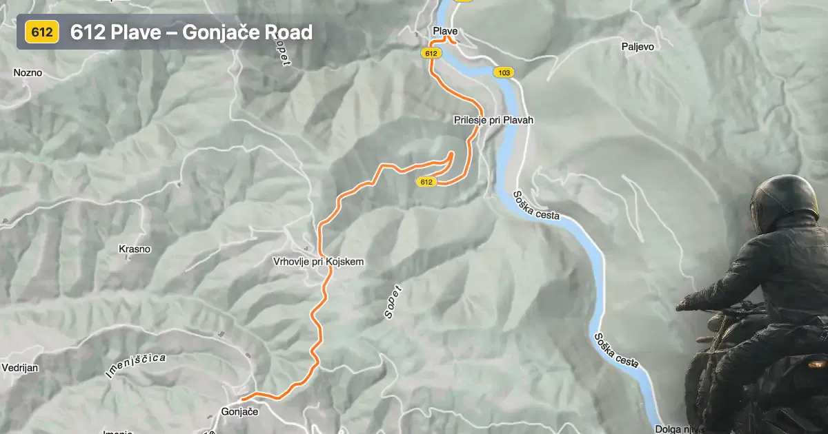 The 612 Plave – Gonjače road is open to motorcycles throughout the year, with no regular seasonal closures reported. However, as with many mountain and rural roads in Slovenia, temporary closures may occur due to maintenance work, local events, or adverse weather conditions, particularly during periods of heavy rain or snow. Riders are advised to check local traffic updates before setting out. There are currently no restrictions specific to motorcycles on this route. For up-to-date information on road conditions and closures in Slovenia, consult the official Traffic Information Centre for Public Roads.
