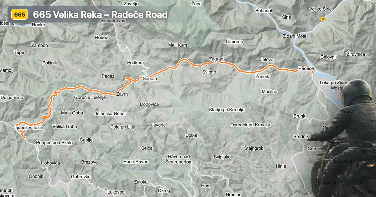 The 665 Velika Reka – Radeče road is situated in central Slovenia, traversing a region characterized by rolling hills and forested areas. The route begins near the town of Radeče and extends towards Litija, passing through several settlements including Borovak pri Podkumu, Zagrad, Titova ulica, Jagnjenica, Njivice, and Stari Dvor. The road covers a total distance of approximately 28 km (17.4 miles), making it suitable for a half-day ride or as part of a longer tour through the region. An interactive map showing the road can be found at the end of the article.
