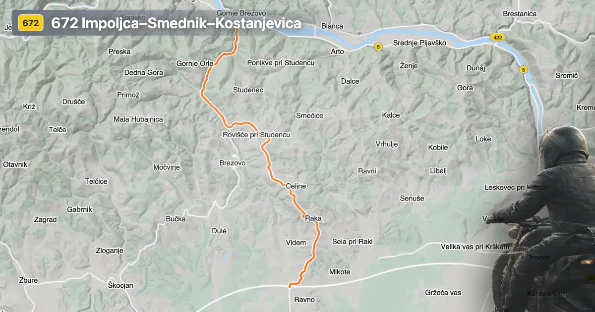 The 672 Impoljca–Smednik–Kostanjevica route is situated in southeastern Slovenia, connecting the settlements of Impoljca, Smednik, and Kostanjevica na Krki. The road traverses a region characterized by rolling hills, agricultural landscapes, and proximity to the Krka River. The starting point is near Kostanjevica na Krki, a historic town known for its island setting and cultural heritage, while the route’s endpoint is close to Sevnica, a town with a medieval castle and a vibrant local community. An interactive map showing the road can be found at the end of the article.