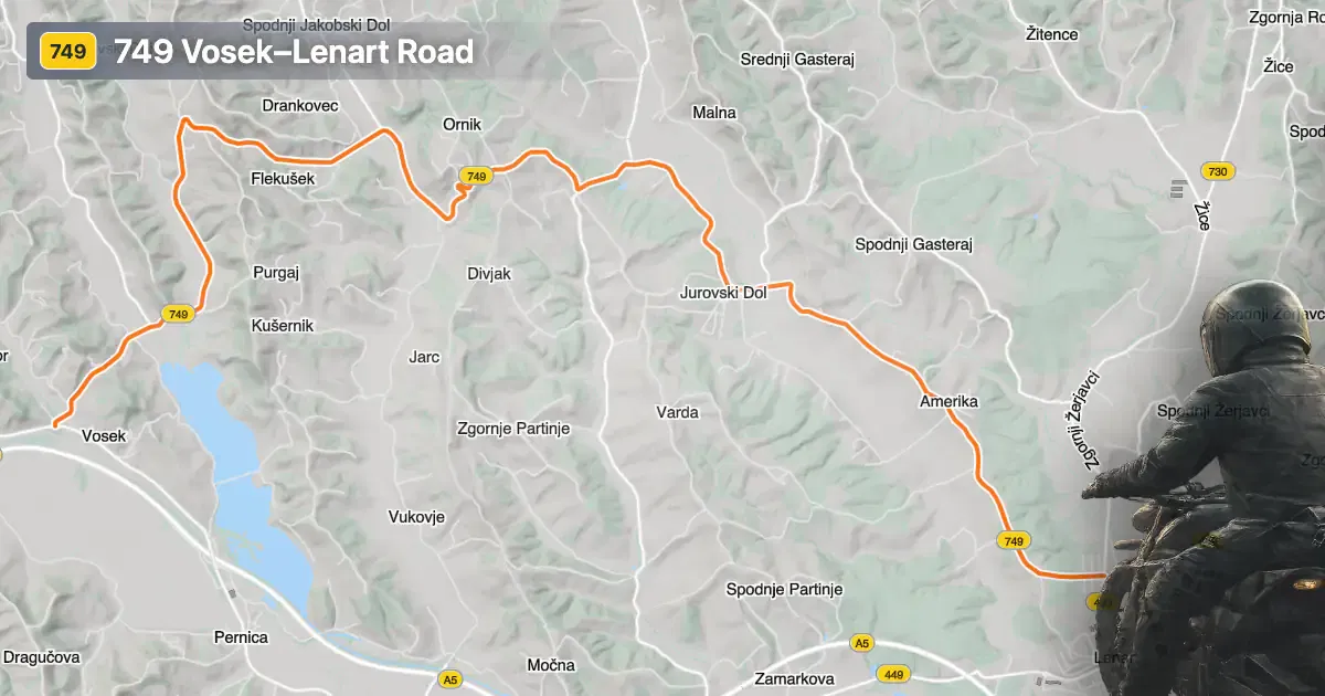 The 749 Vosek–Lenart road is open to motorcycles year-round, with no regular seasonal closures reported. There are no known restrictions specific to motorcycles, and the road remains accessible except during occasional maintenance works or local events, which may result in temporary closures or detours. Riders are advised to check local traffic updates before departure, especially during periods of adverse weather or roadworks. The maximum speed limit along the route is 50 km/h (31 mph), reflecting the road’s passage through inhabited areas and its rural character. Standard Slovenian traffic regulations apply, and riders should remain vigilant for agricultural vehicles and local traffic, particularly in village sections.