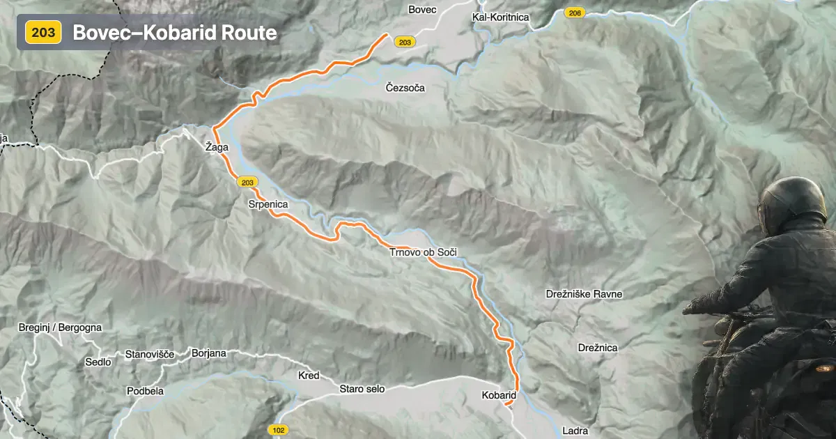 The Bovec–Kobarid road extends for approximately 19.7 km (12.2 miles), with elevations ranging from 221 m (725 ft) to 428 m (1,404 ft) above sea level. The road surface is asphalt and is generally of high quality, providing a smooth ride for most of its length. The majority of the route consists of two lanes (about 96%), with a wide carriageway for most of the distance (about 77%). Only a small portion is narrow or single-lane, which may require caution when passing through. The road is moderately curvy, offering a mix of gently curved and more technical sections, but it is not considered extremely twisty. Speed limits vary along the route, typically set at 90 km/h (56 mph), 70 km/h (43 mph), and 50 km/h (31 mph) depending on proximity to settlements and road conditions. The route passes through inhabited areas for roughly a third of its length, providing occasional opportunities for rest stops and refreshments.
