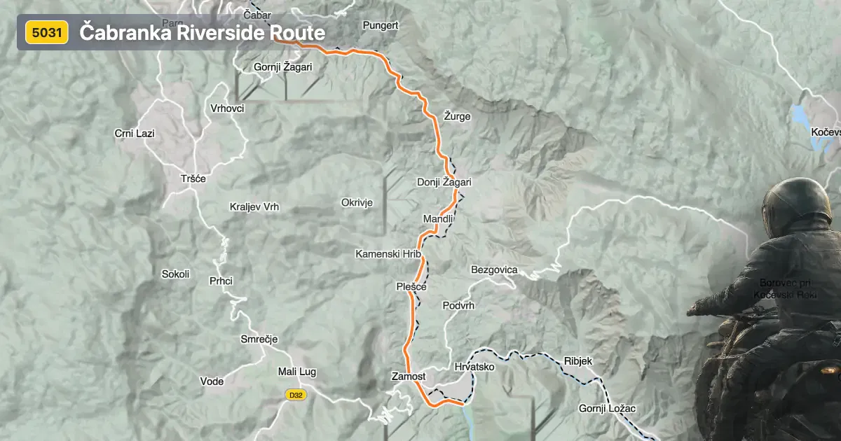The defining natural feature of this route is its close alignment with the Čabranka River, a tributary of the Kupa River. For nearly 98% of its length, the road runs adjacent to the river, providing continuous views of the waterway and the surrounding riparian environment. The proximity to Nacionalni park Risnjak adds ecological significance, as the park is home to lynx, bears, and a variety of bird species. The town of Čabar serves as a convenient base for exploring the region, offering basic amenities and access to local cultural sites. Riders interested in extending their journey can explore the broader Gorski Kotar area, known for its forests and outdoor activities.