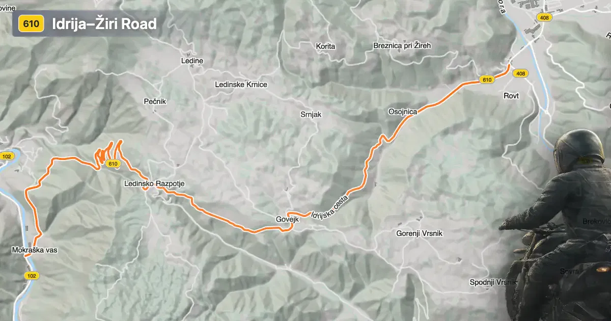 The Idrija–Žiri road is situated in western Slovenia, linking the towns of Idrija and Žiri. The route traverses the hilly terrain between these settlements, passing through smaller villages such as Žirovska cesta, Idrijska cesta, Govejk, Mokraška vas, and Ledinsko Razpotje. The road lies within the traditional region of Inner Carniola, an area known for its karst landscapes and historical mining heritage. An interactive map showing the precise route can be found at the end of this article.