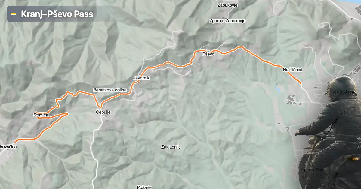 The Kranj–Pševo Pass is generally open to motorcycles throughout the year. However, as with many alpine routes, riders should be aware of potential weather-related closures, particularly during winter months when snow or ice may make certain sections hazardous or temporarily impassable. There are no permanent restrictions for motorcycles, but local authorities may implement temporary closures due to maintenance or adverse conditions. It is advisable to check with the Slovenian Traffic Information Center for current road status before planning a ride.