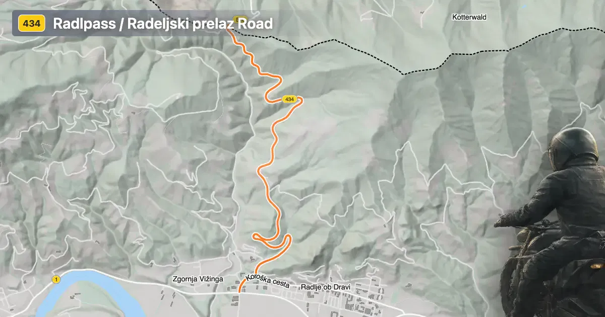 The 434 Radlje – Radeljski prelaz road is situated in northern Slovenia, beginning near the village of Zgornja Vižinga and ascending to the Radlpass (Radeljski prelaz), which marks the border with Austria. The route passes through the settlement of Koroška cesta before reaching the mountain pass at an elevation of 661 m (2,169 ft). The road is positioned within the eastern Alps and serves as a key connection between the Drava Valley and the Austrian region of Styria. An interactive map showing the precise route of the 434 Radlje – Radeljski prelaz road can be found at the end of this article.