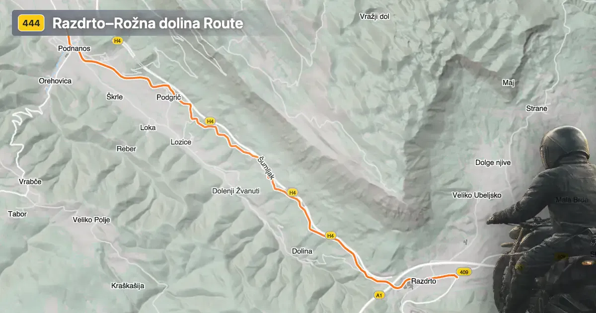 The Razdrto–Rožna dolina route is situated in southwestern Slovenia, traversing the edge of the Karst plateau and descending into the Vipava Valley. The road begins near the village of Razdrto, passes through Rebrnice, and concludes at Podnanos. This corridor serves as a connector between the interior of Slovenia and the coastal region, making it a strategic route for both local traffic and touring motorcyclists. The Vipava Valley, known locally as Vipavska dolina, is recognized for its unique microclimate and wine production. An interactive map showing the full extent of the Razdrto–Rožna dolina route can be found at the end of this article.