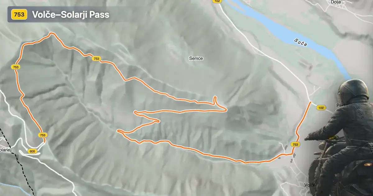 The Volče–Solarji Pass is generally open to motorcycles throughout the year, but riders should be aware that winter conditions can lead to temporary closures or hazardous surfaces due to snow and ice, particularly at higher elevations. There are no permanent restrictions on motorcycle access. However, it is advisable to check local traffic updates or the Slovenian Traffic Information Center for current road conditions, especially during the colder months or after severe weather events.